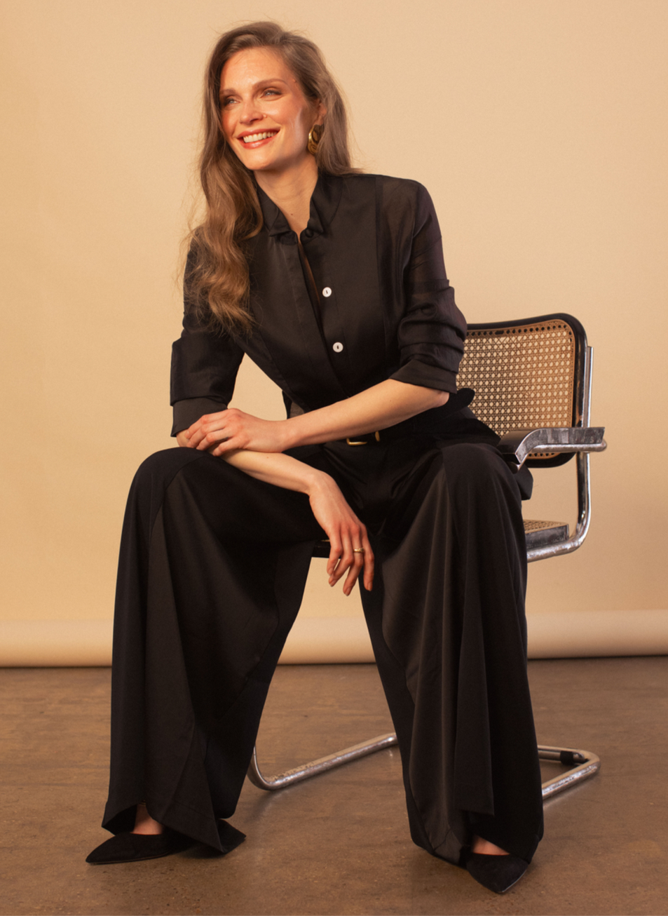 This women’s luxury shirt drapes beautifully with a relaxed silhouette that feels both elevated and understated. Subtle side-button detailing allows you to customise the fit, cinching the waist for a sculpted, tailored shape or wearing it loose for a more laid-back, fluid look.