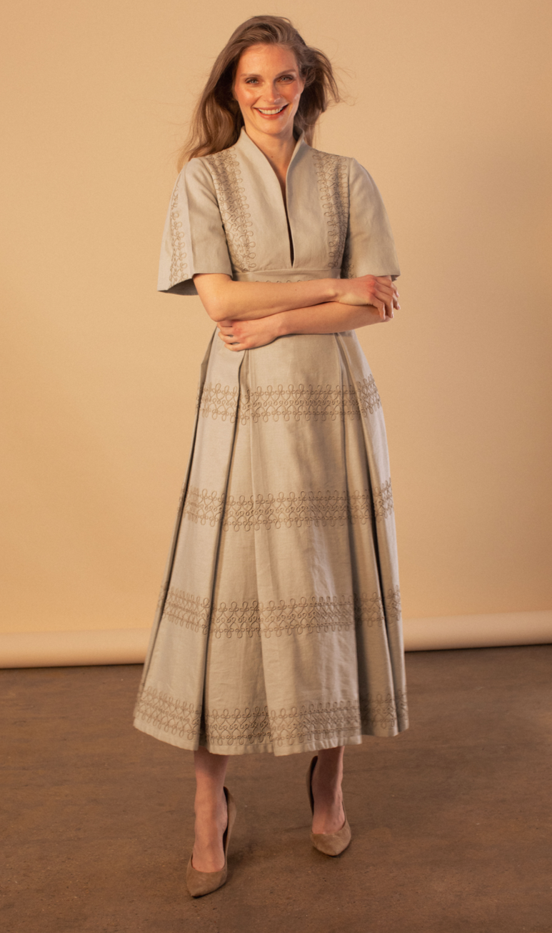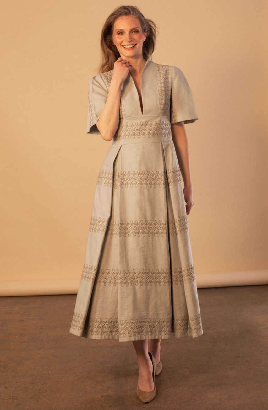Our women’s tailored linen embroidered dress is designed with a sculpted silhouette that highlights the body while maintaining a modern, structured presence. The signature split stand collar elevates the neckline, creating a clean, elongated frame that feels strong, elegant, and contemporary.