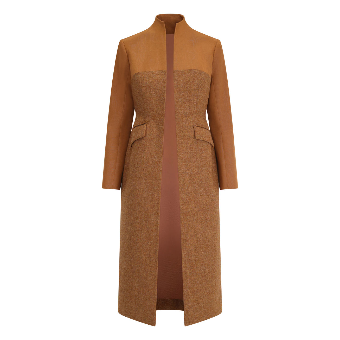 A longline coat crafted from rich 100% wool and contrasted with smooth silk moiré panels for a refined, architectural finish. Its structured silhouette and clean lines create an effortlessly elegant look, offering warmth, texture, and modern sophistication in equal measure.